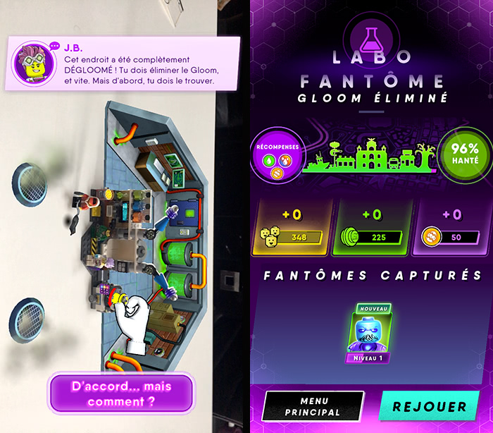Maintenant que l'ensemble est monté, nous pouvons lancer l'application pour profiter de la réalité augmentée. Pour cela il suffit de scanner la construction avec l'application, une fois figée, vous pourrez interagir pour faire apparaitre des fantômes autour du labo. Des mini-jeux sont aussi proposé, afin de partir à la chasse aux fantômes.